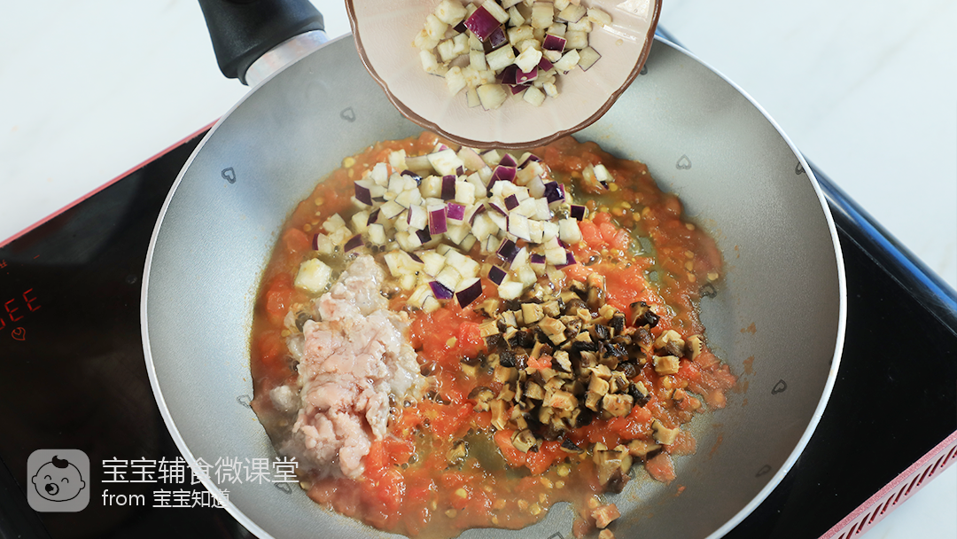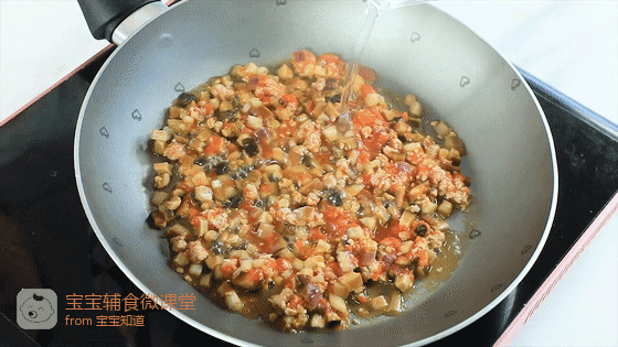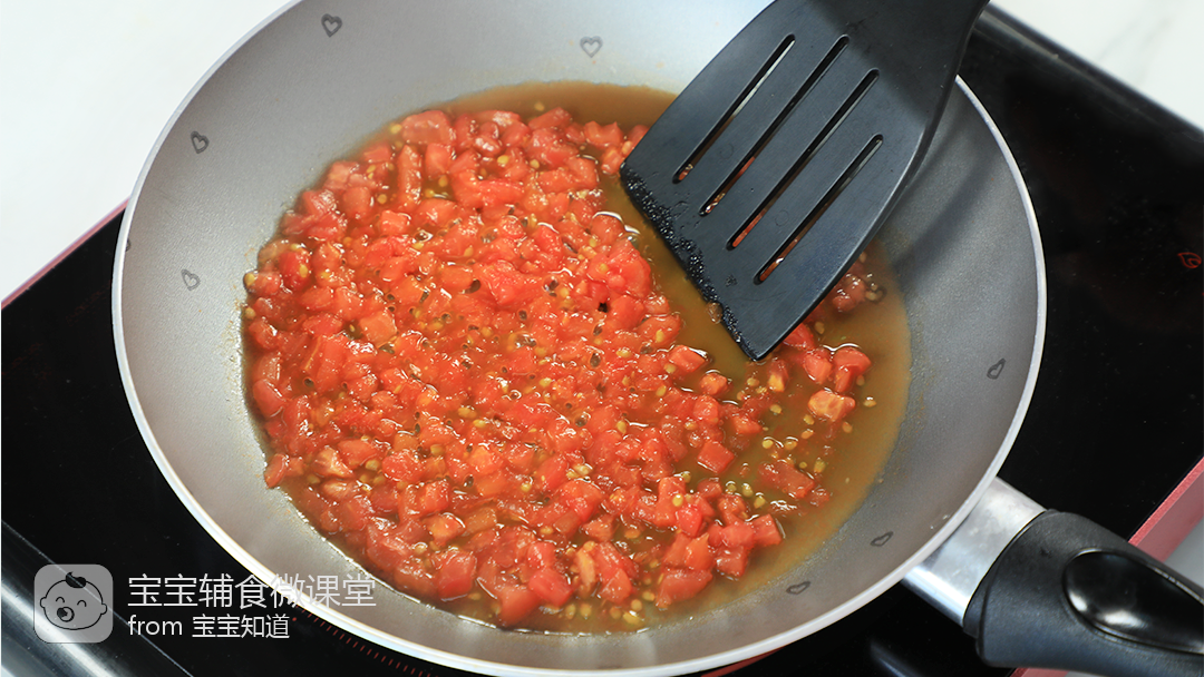 11、起锅刷薄薄的一层油,倒入番茄丁翻炒2分钟,至出汁。