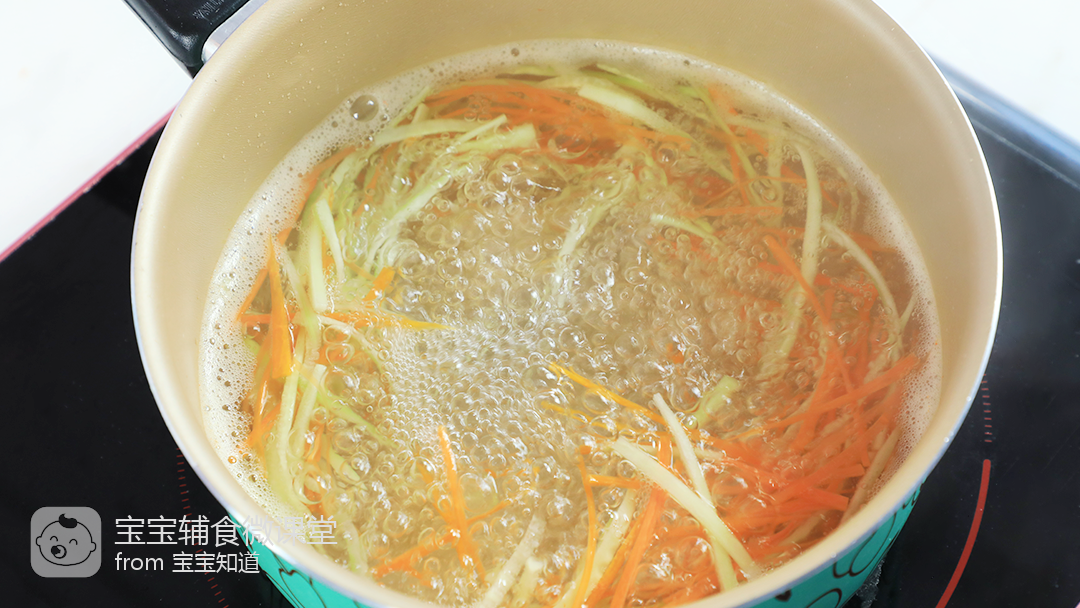 5、奶锅水开后倒入胡萝卜丝、青瓜丝煮5分钟。