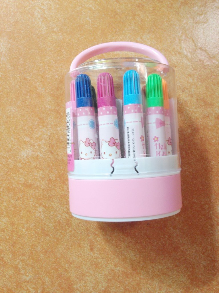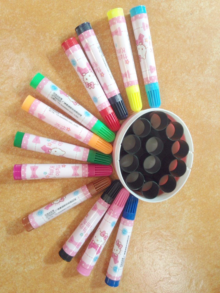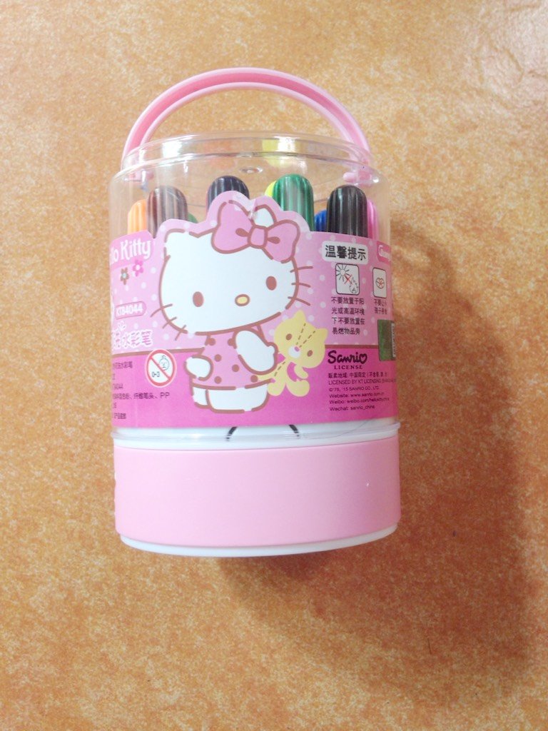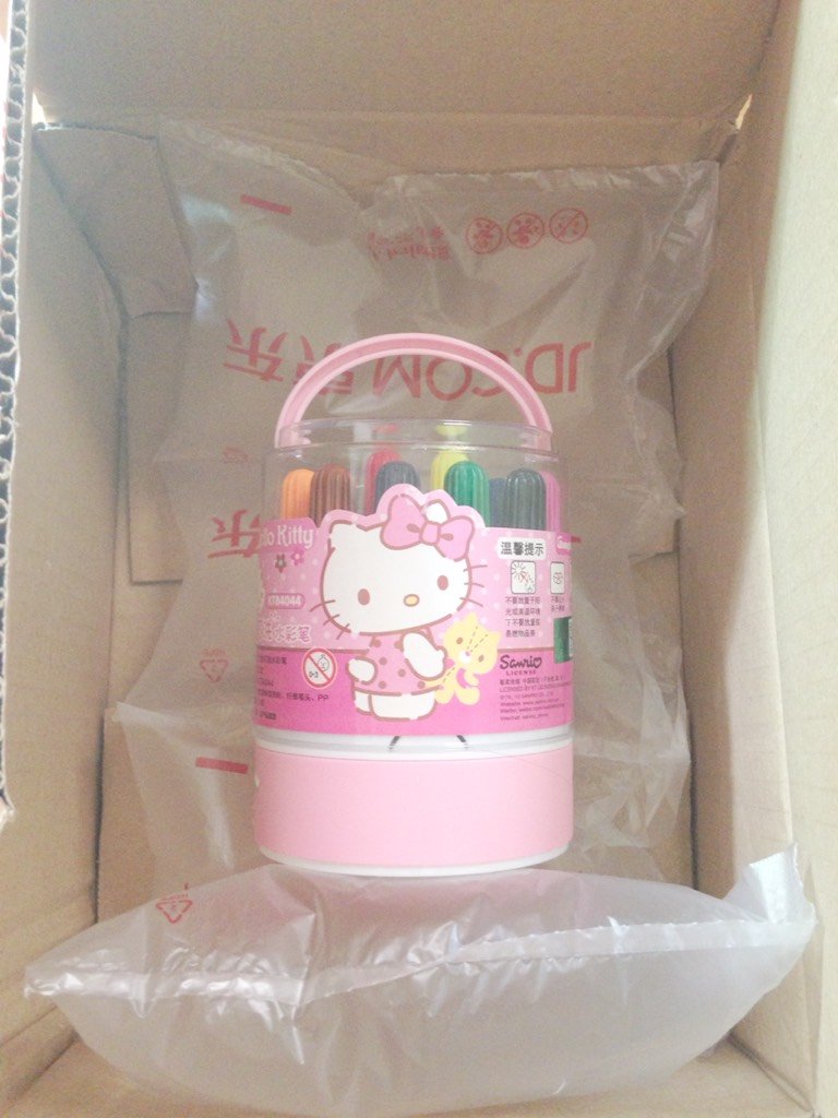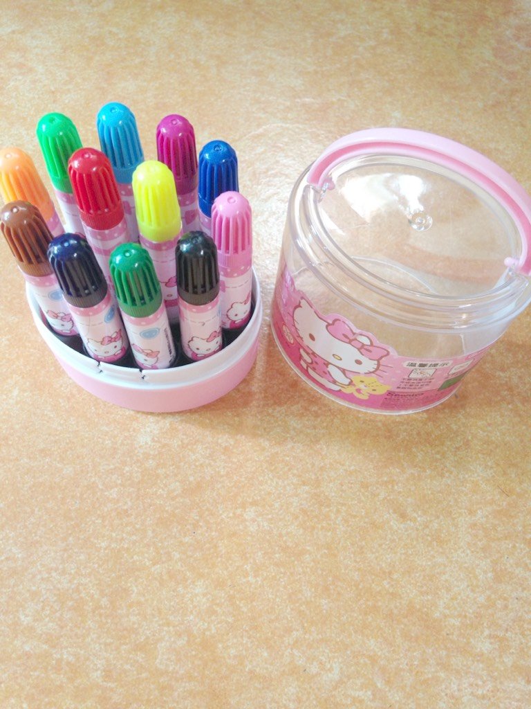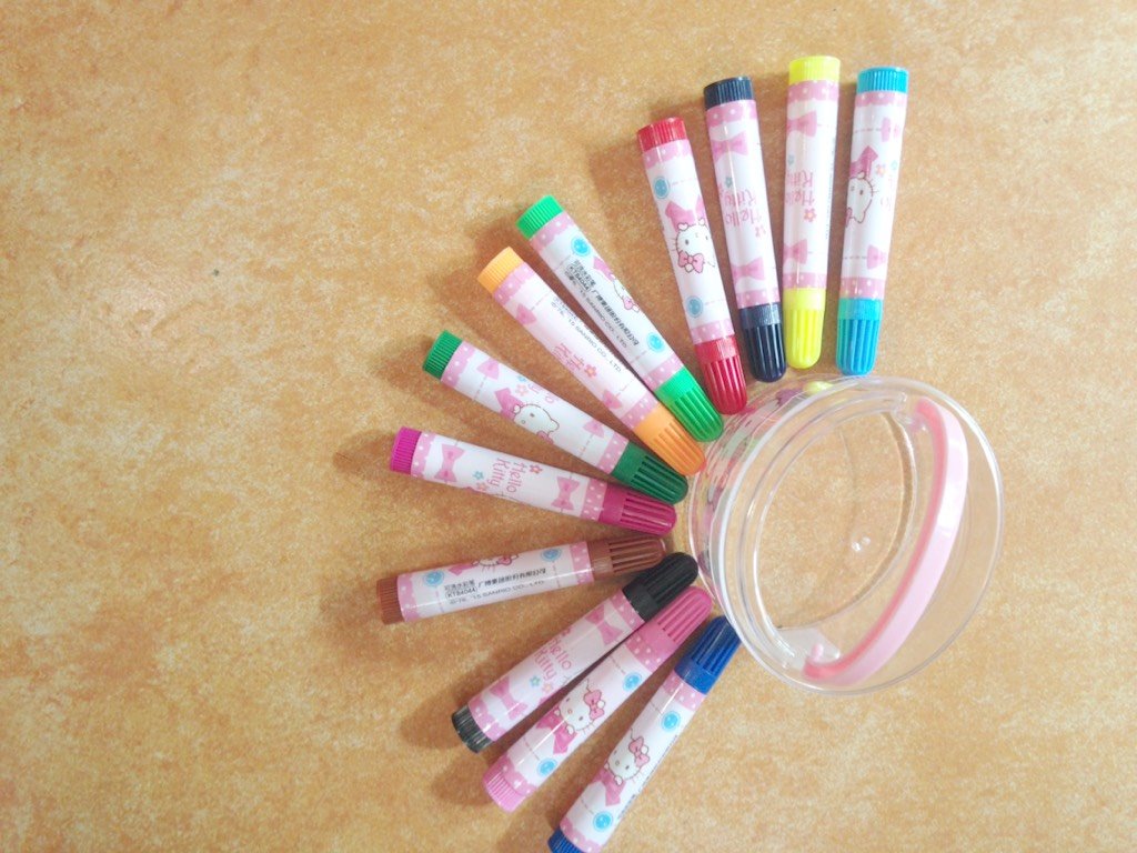 这一次,酷爱凯蒂猫的我,又魔怔了,毅然决然又选择了水彩笔,是不是对我有点无语了呀!我对自己都很无语,哈哈。凯蒂猫水彩笔,和真彩的一样,都是12色的,也是可水洗的,质量不错。
