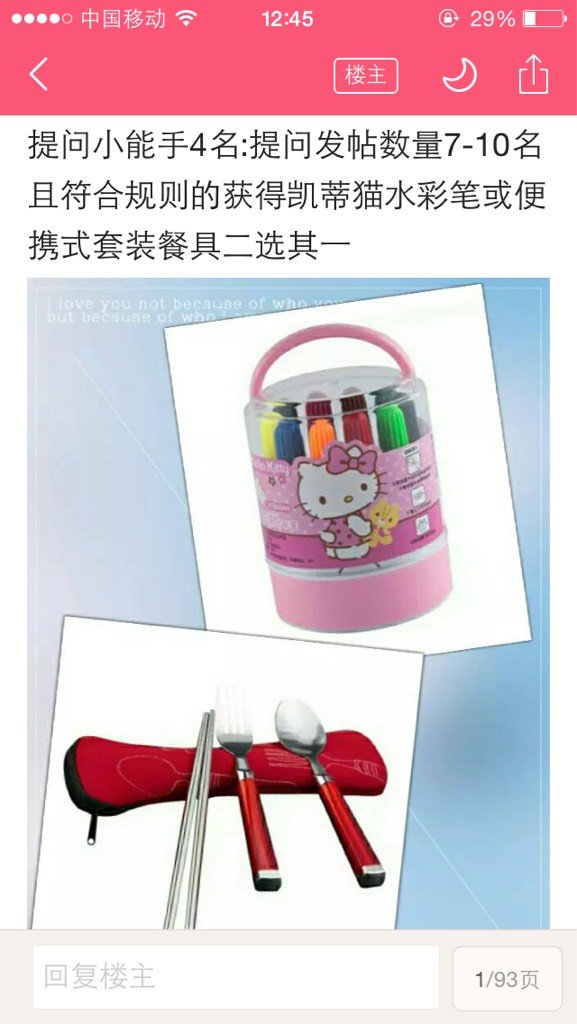 作为一位新手妈妈,当时的我真的有许许多多的问题,正好借着圈主鑫鑫小爱的新手妈妈问活动,一口气发出了二十多篇提问帖,后来又因宝宝不舒服的原因,照顾宝宝要紧,中途就放弃了,等到看到颁奖帖时,发现里面又有我的昵称,竟然还成了一位提问小能铜渐手,哈哈!
