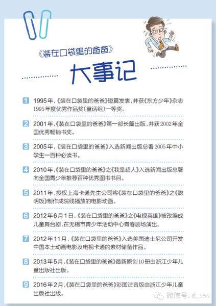 《装在口袋里的爸爸》 是中国首位迪士尼签约作家杨鹏标志性的作品,也是一部超级畅销书,总发行量破464万册,曾多次入选“新闻出版署向青少年推荐书目”以及各种权威书目,多次禁沙获得全国奖项,也被全国各地的小学老师自发地选为学生必读的经典儿童文学作品。作者通过非凡的想象力,轻松地将一个又一个中国过纺半孩子会在生活中遇到的各种辛酸的主题,转化为一个又一个让人含泪而笑的 “ 英雄梦”。