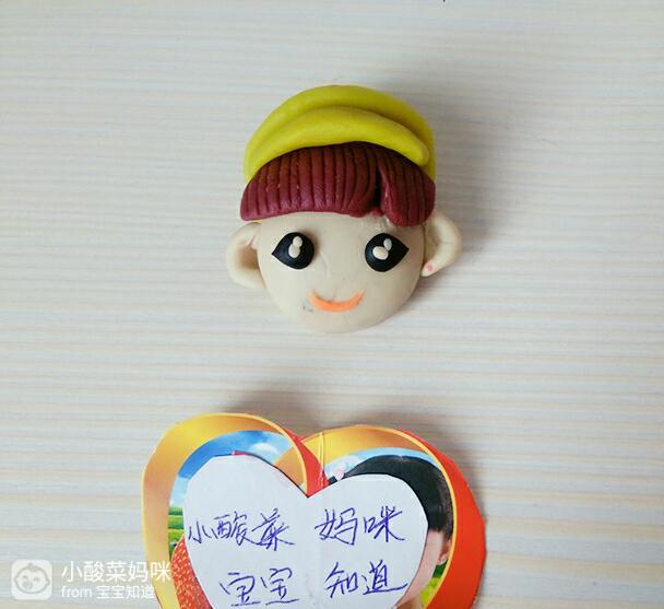 5用橙色彩泥搓条两头尖的圆形,作嘴巴粘在眼睛下方呈微笑形,如图