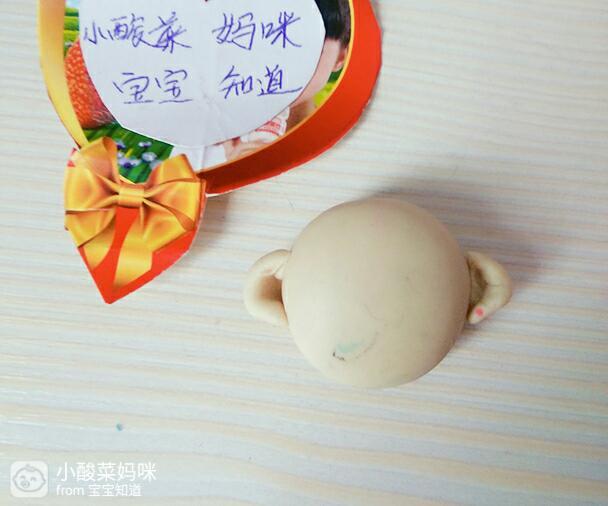 用肉色彩色搓个圆形,压扁,作头部,再搓个小圆,压扁,切开两半,中间捏凹点,作耳朵粘在头部两侧,如图