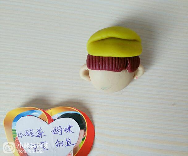 2用咖啡色彩泥捏出刘海,粘在头顶上,用工具刀压出发丝。再用黄色彩泥搓一大一小的圆形,压扁,如图粘在一起,注意称惠虏小的圆形在下面哦。