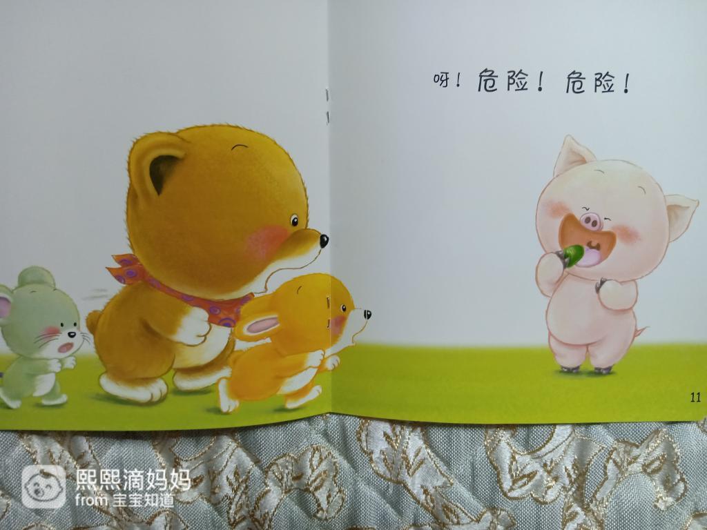 小熊和小兔子,小老鼠一起去找小猪玩,正好看见小猪好像在吃一个什么东西,小熊赶紧说:“呀!危险!危险!”