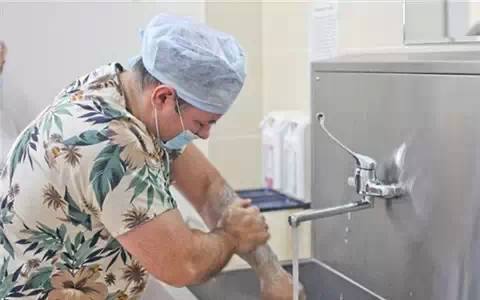 主刀医生在清洗手臂,保证术中无菌操作