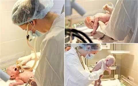 睡梦中的宝宝,在医生小心呵护下降生