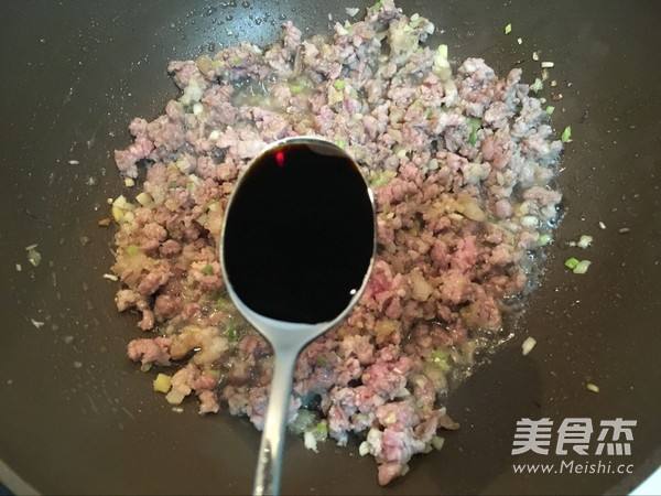 6. 倒入瘦肉末炒至肉末发白,在加入一勺盐提味,一勺老抽上色。