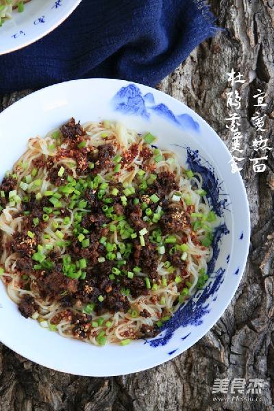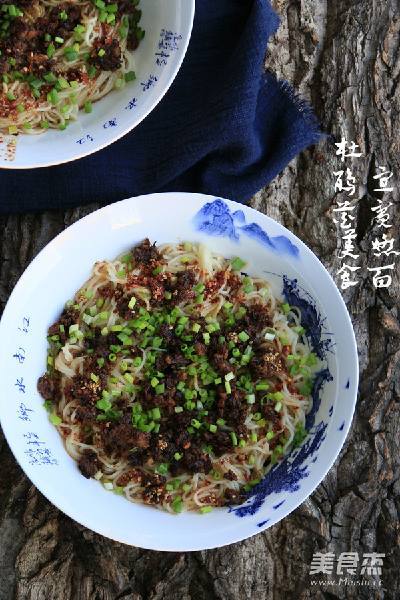 14. 面条放入碗中,加入调好的料汁、在浇上炒好的肉末,撒些葱花和花生碎熟芝麻以及少许白糖,搅拌均匀就可以吃啦!每一碗面白糖的用量比味精稍多,白糖是最好的提鲜中和辣味的一道厨房必备品!