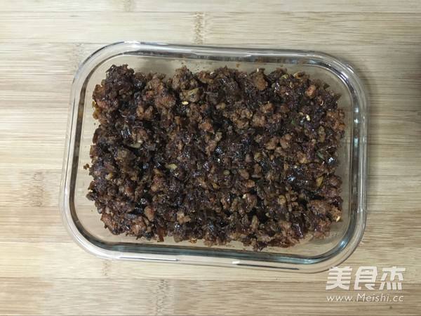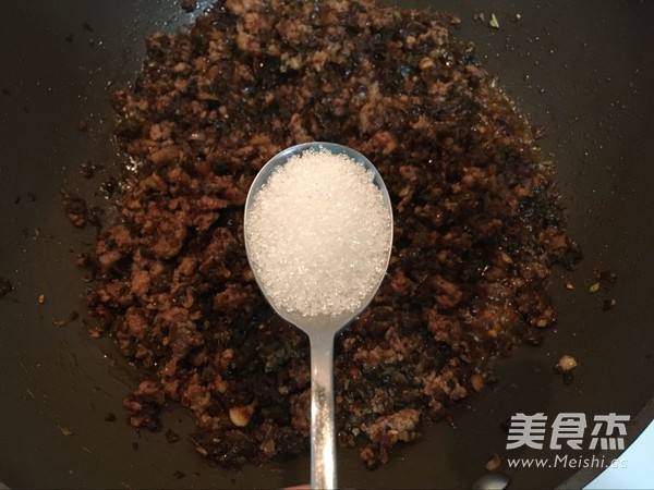 8. 如果觉得比较辉截干,还可以再加入适量植物油,加入碎米芽菜以后肉末就变得比较干了。出锅前加入1勺白糖,中和一下辣味,糖会让辣味变得更柔和。