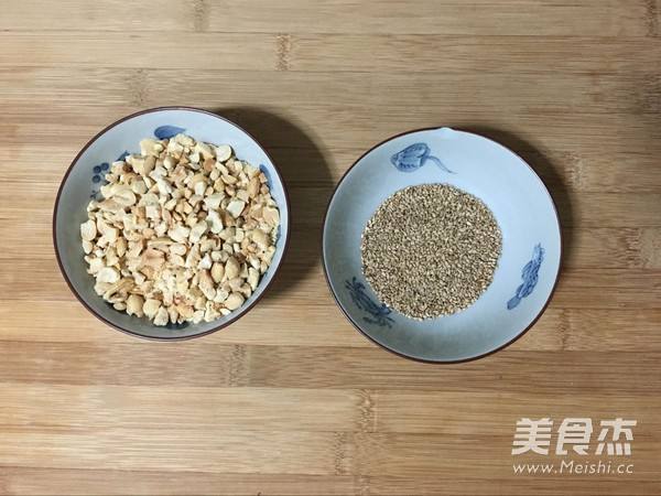 12. 花生碎和熟芝麻也可以一次多准备些。花生可以180度烤7或8分钟后拿出来晾凉,去皮,放袋子里用擀面杖压碎。白芝匪肆麻也同样烤熟。