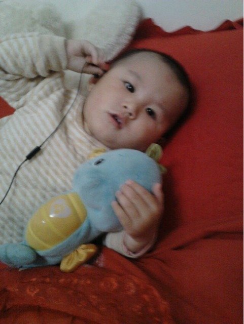 这是宝贝一岁零两个月睡前拍的,抱着我给她买的费雪安抚小海马,有没有很像男孩子