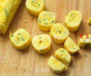 5 将厚蛋烧切片再对切,饭盒里摆上生菜,米饭用圆模做成圆形。