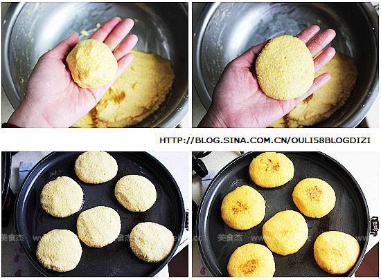 3. 醒好的玉米面图拿出,揪成小块,团圆后压成饼状,放在抹油的平底锅或饼铛里小火两面烙熟即可