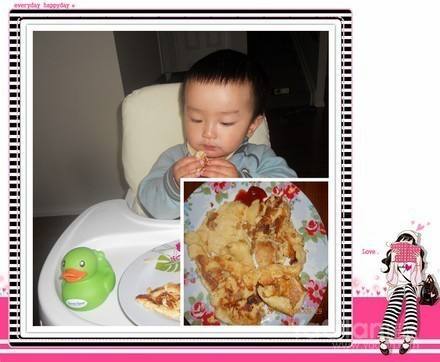 这是妈妈给我做的鸡蛋牛奶饼,味道浅裕好极了!看我吃得多认真呀!