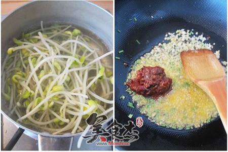 3. 豆芽入开水锅中氽至半熟,取出备用;将3瓣蒜,等量的生姜及小葱切成末;锅里放刚才爆香过的香料油烧热,入葱姜蒜末翻炒片刻,调入适量豆瓣酱翻炒至出红油,放入适量鱼骨及鱼块一起煸炒至略熟