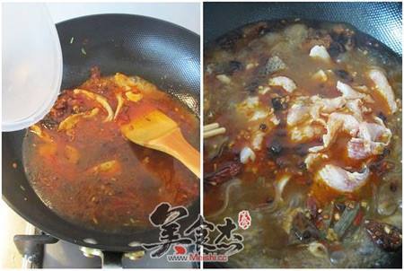 4. 倒入大盘水入锅中,放入宽粉条一起烧开,调入适量盐及鸡精,保持大火沸腾的状态下,将腌好的鱼片放入锅中用筷子迅速划散,一旦变白变熟即关火保持嫩滑