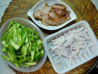 3. 杭细崇椒斜切滚刀块,烤肉切薄片,洋葱切丝备用。