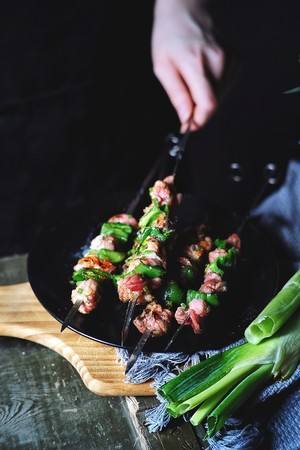 将腌好的羊肉与青椒串上 怕太腻的可以多串点青椒