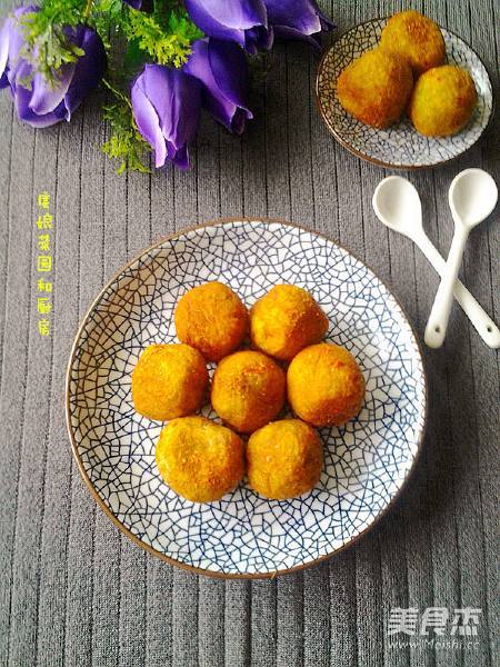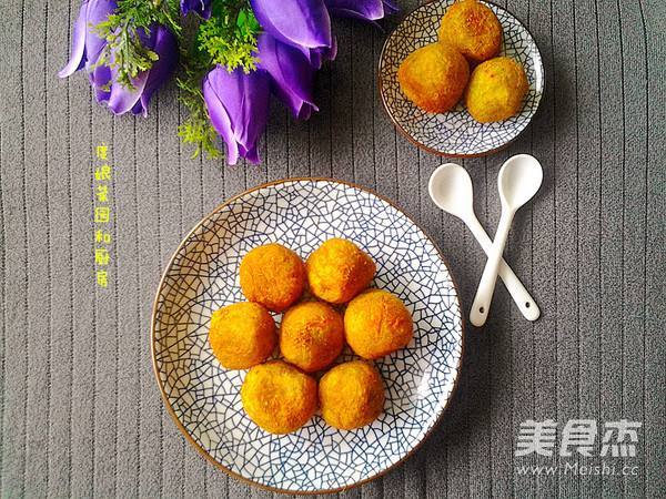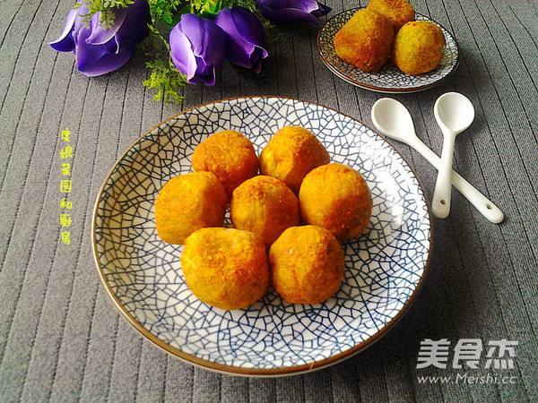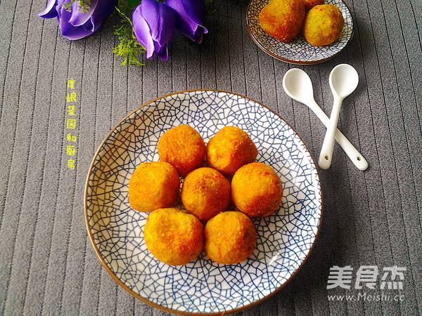 8. 不断用锅铲翻动丸子,使其受热均匀,小火油炸至四周金黄色