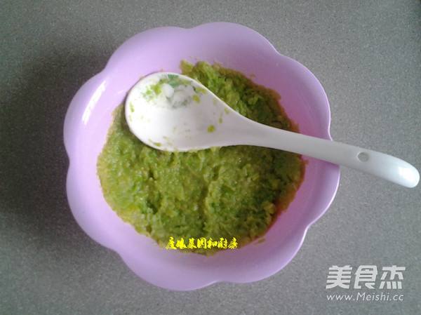 3. 捞出煮烂的蚕豆米控水后,放入盘子中用汤勺背部将其压成泥