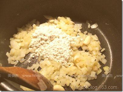 2. 锅里放黄油或橄榄油把洋葱炒至褐色,大概几分钟,然后加入蒜瓣继续炒1分钟左右加入面粉混合均匀再炒1分钟左右