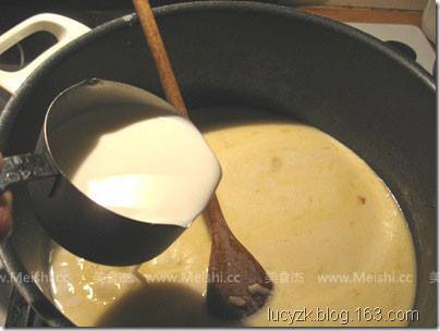3. 加入火鸡高汤,half-and-half,烧开然后改小火