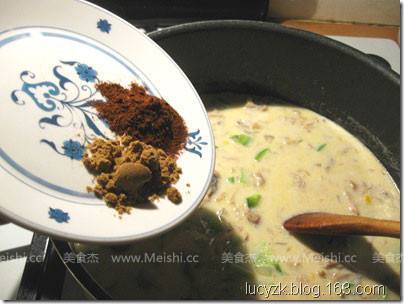 5. 孜然粉,辣椒粉,fajita seasoning,一半的香菜,青辣椒粒和选择项的奶油鸡汤