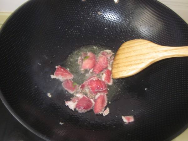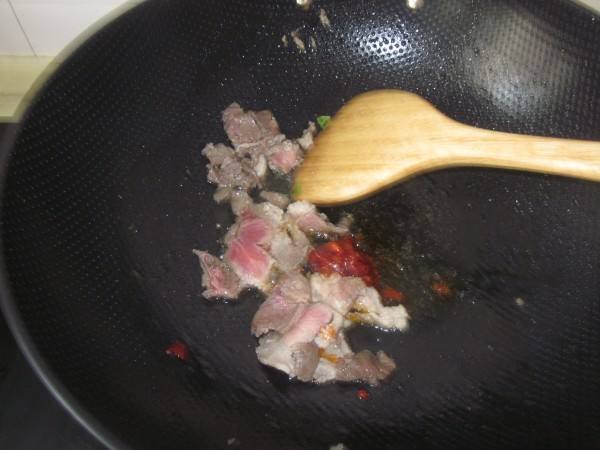 4. 加葱蒜、尖椒,少许酱油,半勺干姜面,少半勺花捆法椒面,少半勺大料面,少许盐炒香