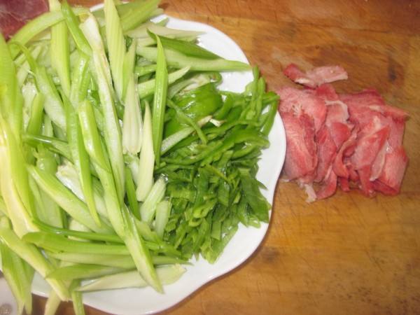 肉炒芹菜的做法 1. 芹菜切细条,猪瘦肉切片,葱蒜切片,尖椒切丝