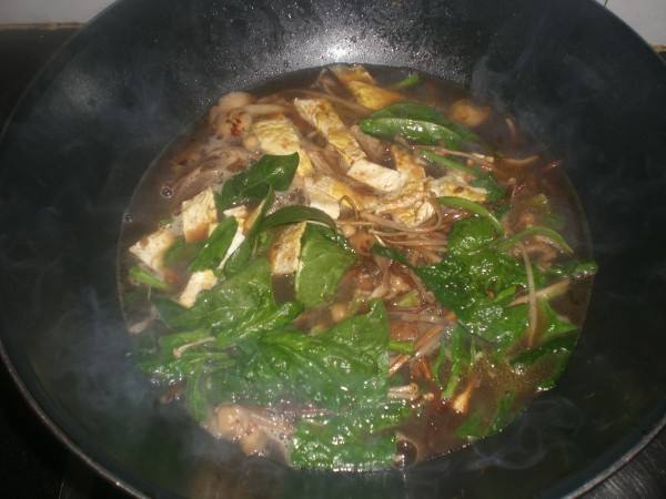 2. 锅中倒油烧热,放入两大勺红油辣酱,炒出红油放适量水烧开后依次放入卫亲金针菇