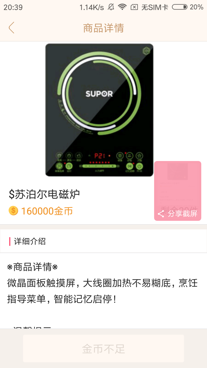 家里的电磁炉已经用了好几年了,变得时好时坏,不是很好用了。所以一直希望能够用自己的努力来兑换呈丛一台新的电磁炉。只是商城里面金币也一路上涨,而我最近却又懒得动弹,每天只能进账80金币,所以,距离自己的理想还差了好大一截。