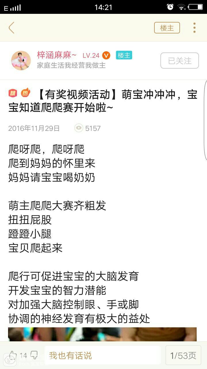 之后就是后来的萌宝冲冲冲活动,看到活动的时候我家宝宝刚刚学爬,我就去参加了。我发的帖子在同龄圈,却不是梓涵麻麻管理的圈子,直到这时候才知道梓涵麻麻是同龄圈主。