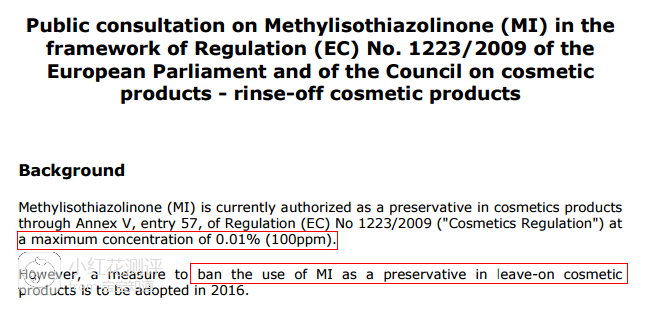 甲基异噻唑啉酮是一种防腐剂,具有皮肤致敏性。欧盟化妆品法规于2016年规定该成分只可在冲洗类产品中使用,且最大允许用量为0.01%。而我国《化妆品安全技术规范》(2015年版)则只规定了最大允许用量为0.01%。