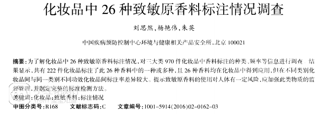 欧盟公布了香精中26种致敏原物质,并规定当在不可冲洗类产品中含量大于等于0.001%时,必须予以标注。而我国化妆品相关法规则规定可以不公布香精具体成分。