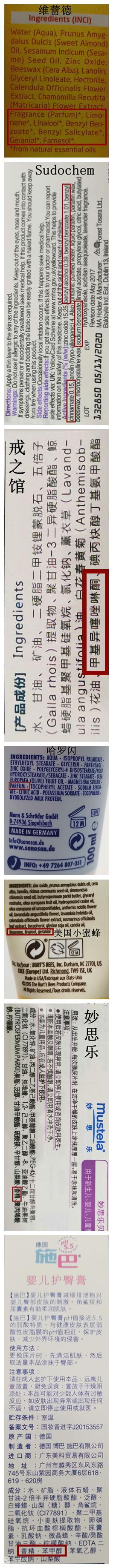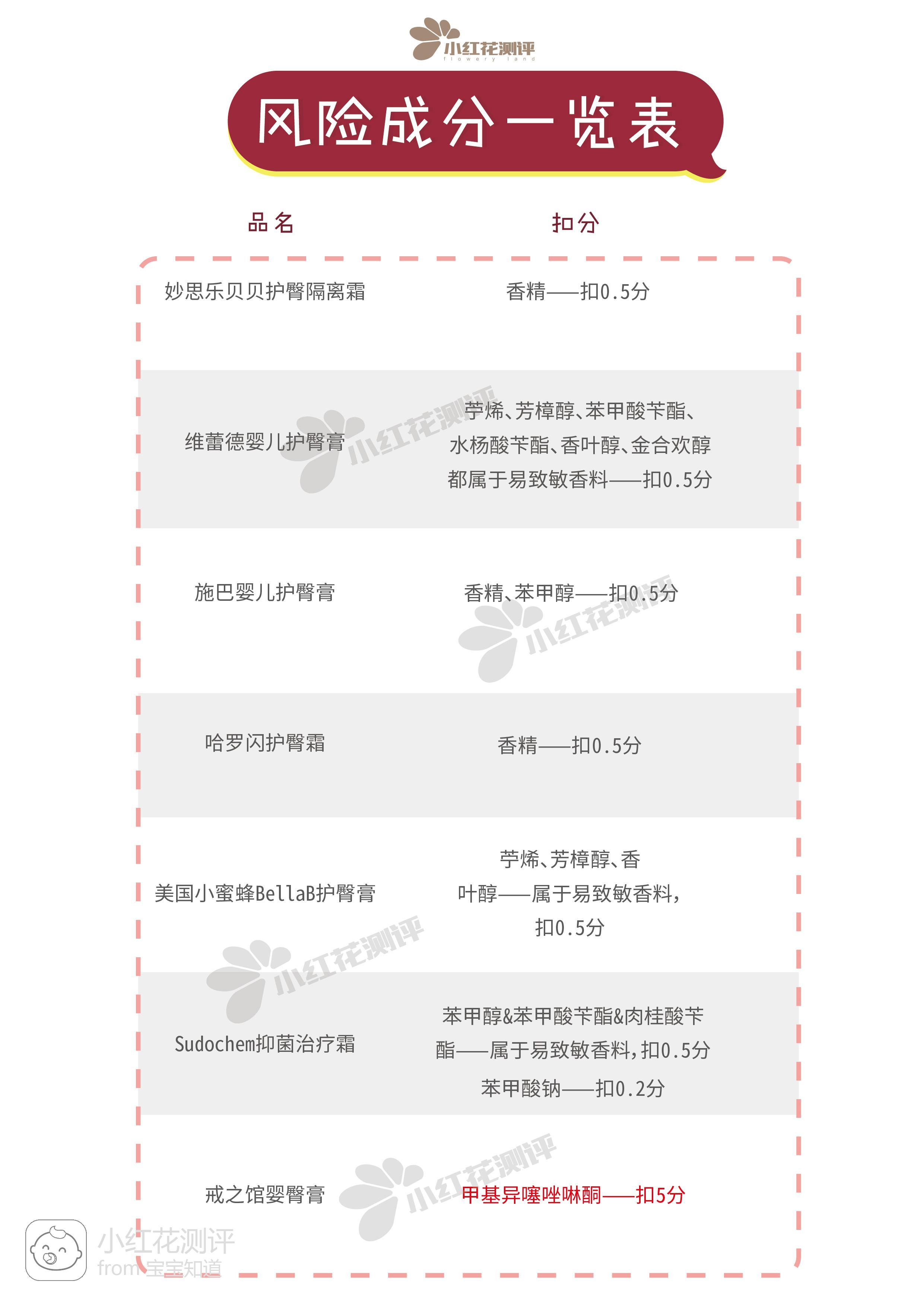 1. “维蕾德”、“美国小蜜蜂”和“Sudochem”都加入了不止一种易致敏香料,如果宝宝刚好是敏感皮肤,那么宝妈就需要警惕这三款护臀霜了。