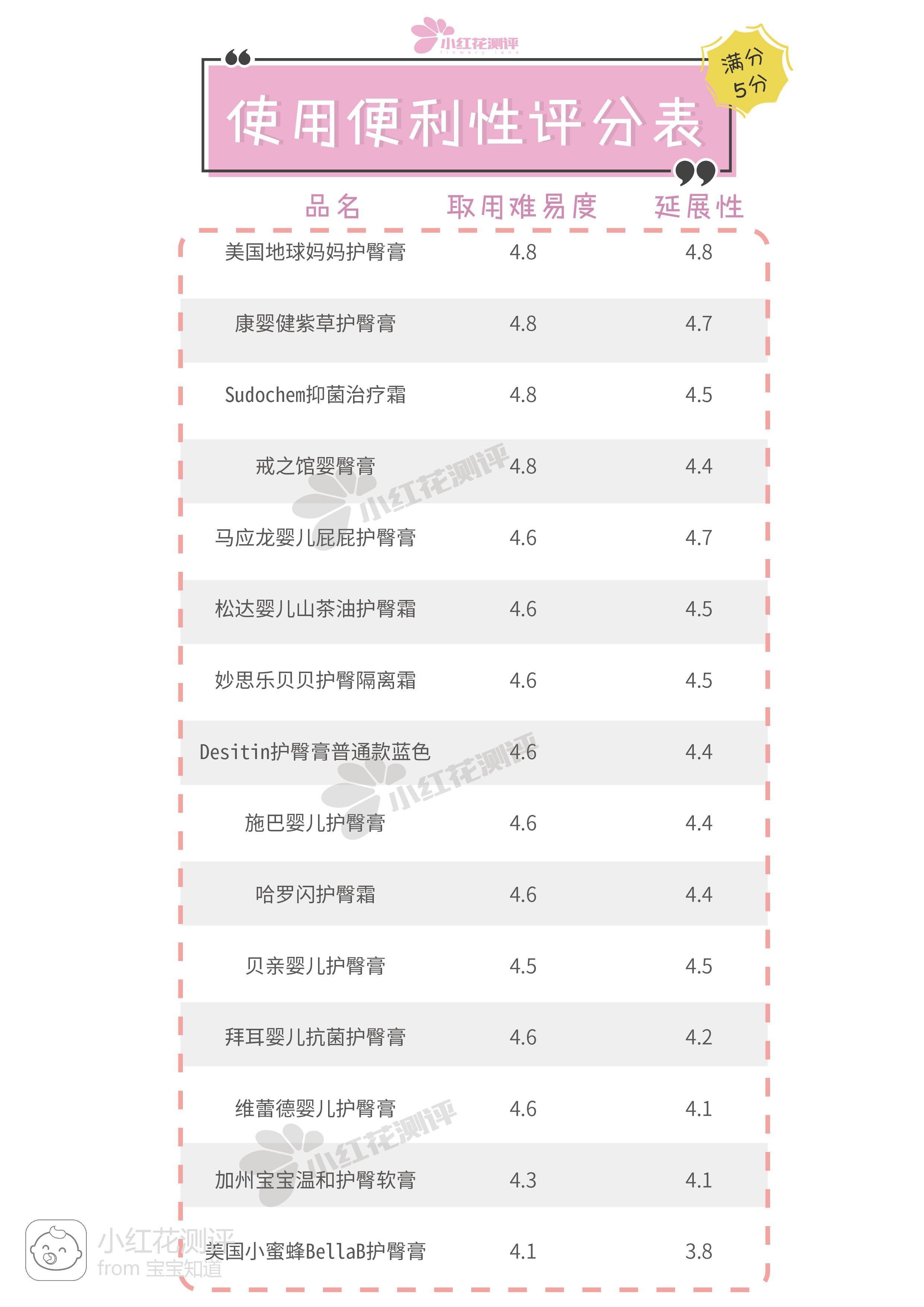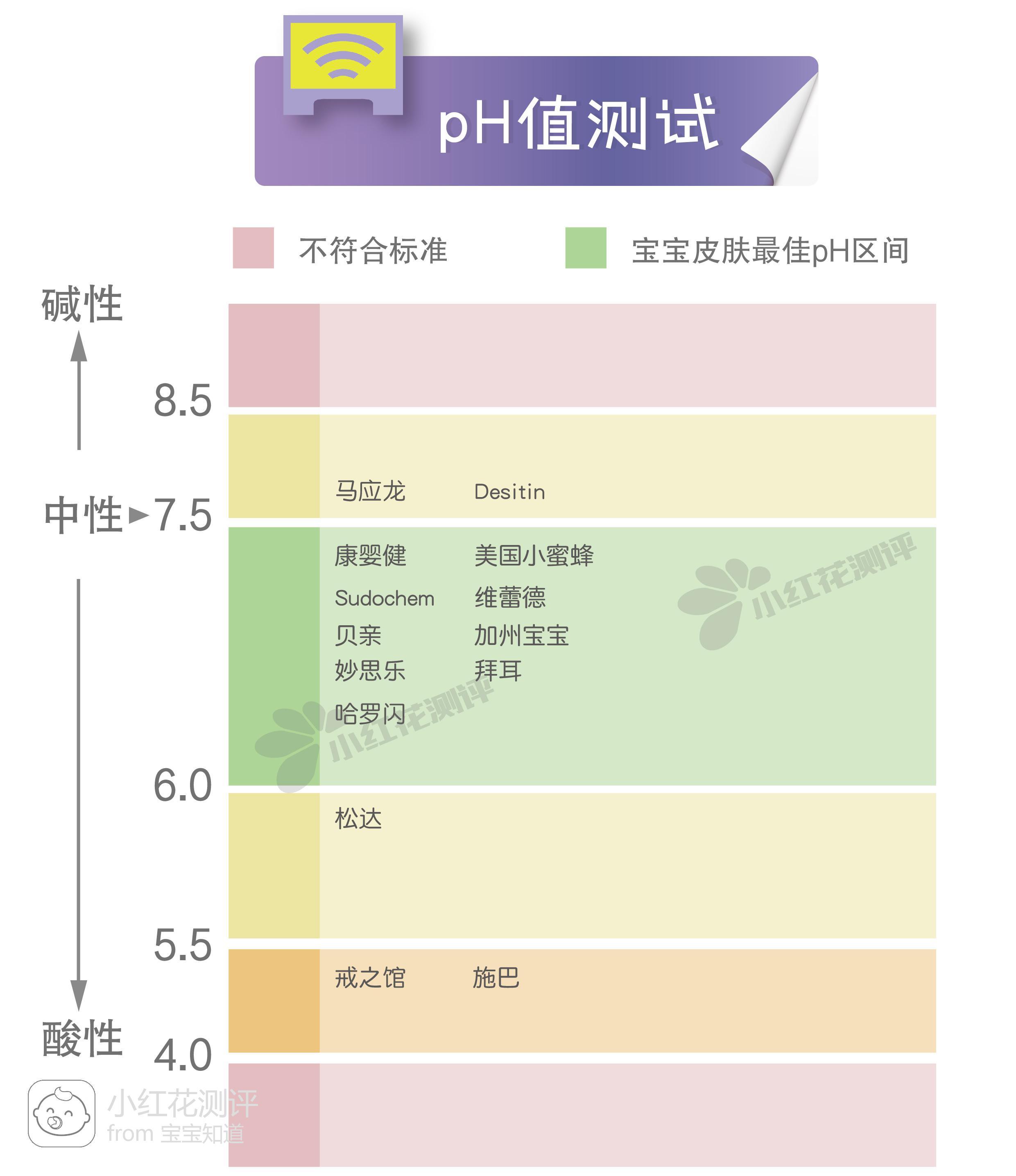 考虑到宝宝的皮肤pH值会在0-18个月时从6.5下降到6.0,然后再下降并稳定在5.5。而会出现“红屁屁”的都是年龄较小还在使用纸尿裤的宝宝,因此小红花测评认为pH值在6.0-7.5的护臀霜都是比较温和的。