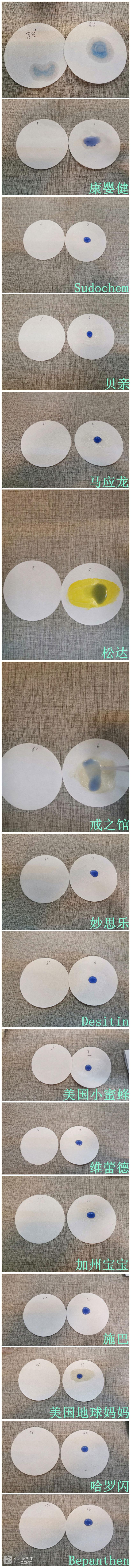 1. 垫在下面的第二张滤纸均未被尿液污染如上图,说明所有护臀霜都可以有效隔绝尿液。