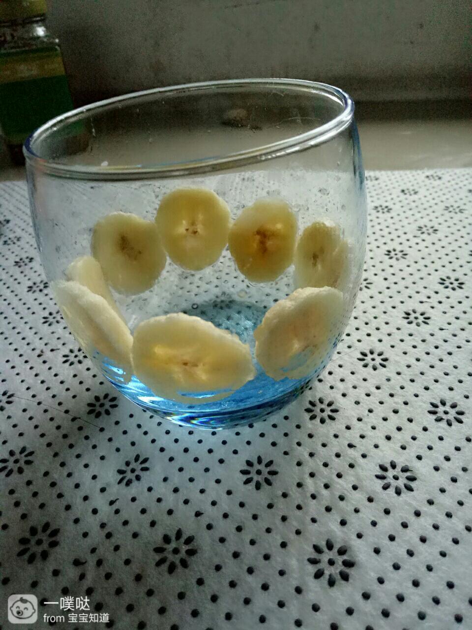 香蕉切薄片,贴在玻璃杯内壁。记得要薄啊,否则贴不住!