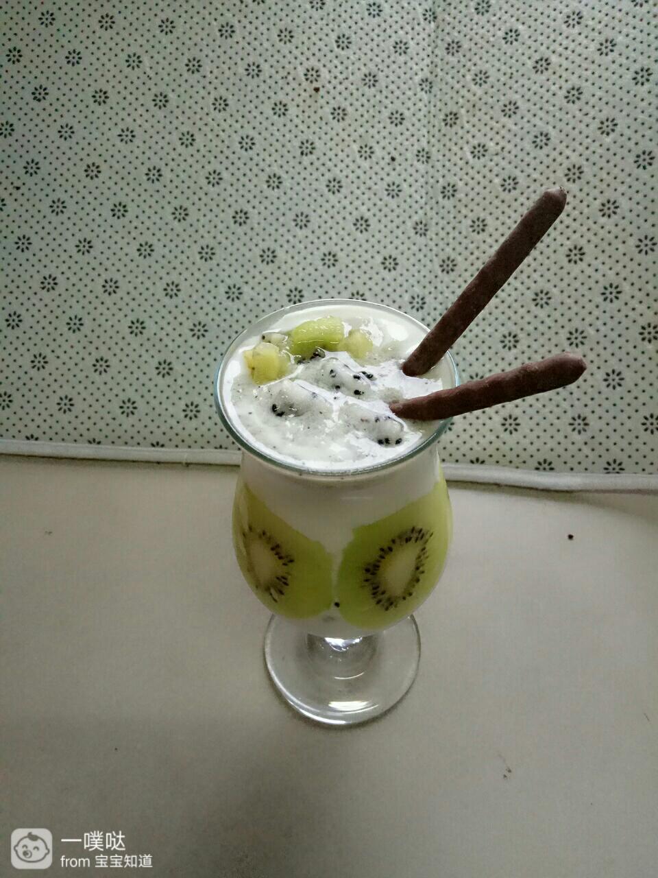 最基厉泳后我又用相同做法做了杯快手版思慕雪。猕猴桃片贴杯内壁,加酸奶,加水果粒,插两根巧克力棒~简单粗暴!完成!