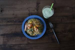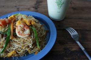 最后放入生抽,耗油,咖喱粉,现磨黑胡椒,翻炒均匀,再放入之前炒好的鸡蛋丝,牛肉丝和虾仁拌均起锅装盘即可