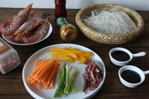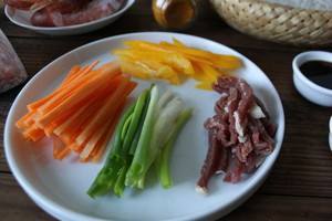 胡萝卜,黄椒,牛肉切成丝,虾剥壳,去虾叨唤宝线,用料酒姜粉盐渍一下去腥