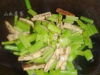 4 锅内放油,油热后放花椒爆香后,倒入芹菜。