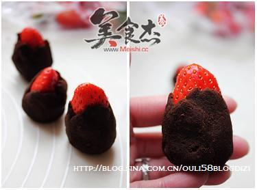 3. 取15克豆沙包裹一颗草莓,并让草莓尖端露出三分之一,再取25克一份糯米面团包住豆沙,滚上一层蒸熟的玉米淀粉即可