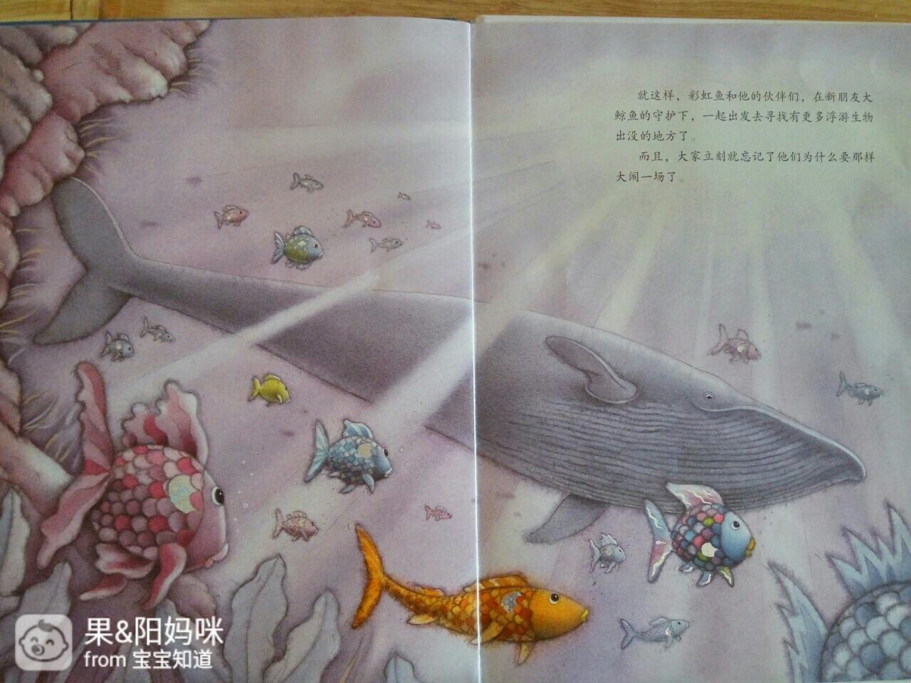 就这样彩虹鱼和伙伴们在老鲸鱼的守护下,一起去找新的食物。大家都忘记了刚才的不开心。