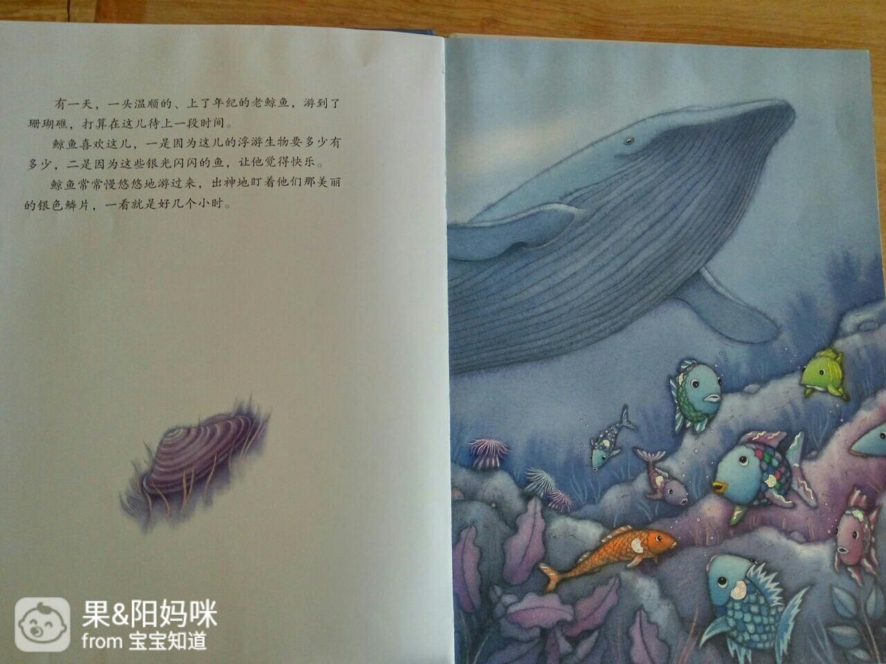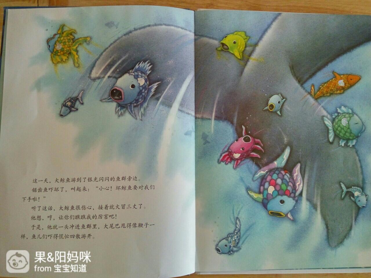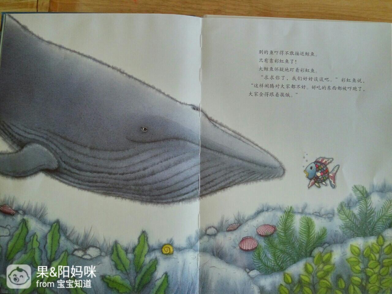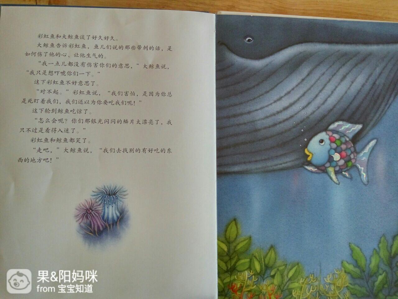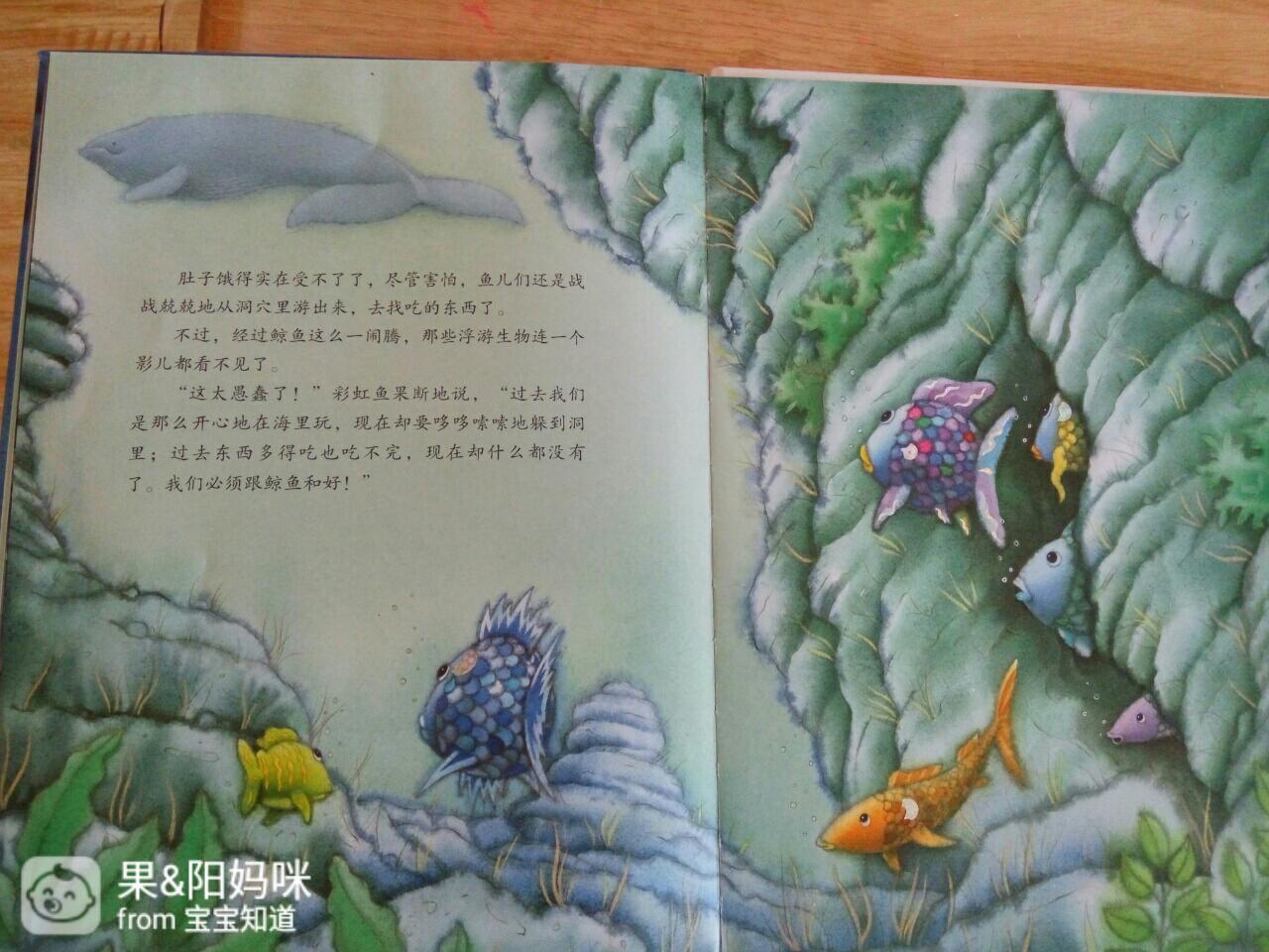 彩虹鱼系列的绘本真的是太漂亮了,鱼儿们身上闪闪发光的鳞片仿佛真的一样,每次看这套绘本,小果总会用手摸摸他们的鳞片,告诉我说:妈妈,他们的鱼鳞好滑啊!今天分享的这本《彩虹鱼和大鲸鱼》讲的是彩虹鱼和伙伴们因为一些误会而和老鲸鱼发生了矛盾,最终经过解释也成为了好朋友。这个故事告诉我们:有的时候,与其自己做一些无谓的猜想,不如与对方开诚布公的交流一下,也许很多麻烦和误会都不会存在了。