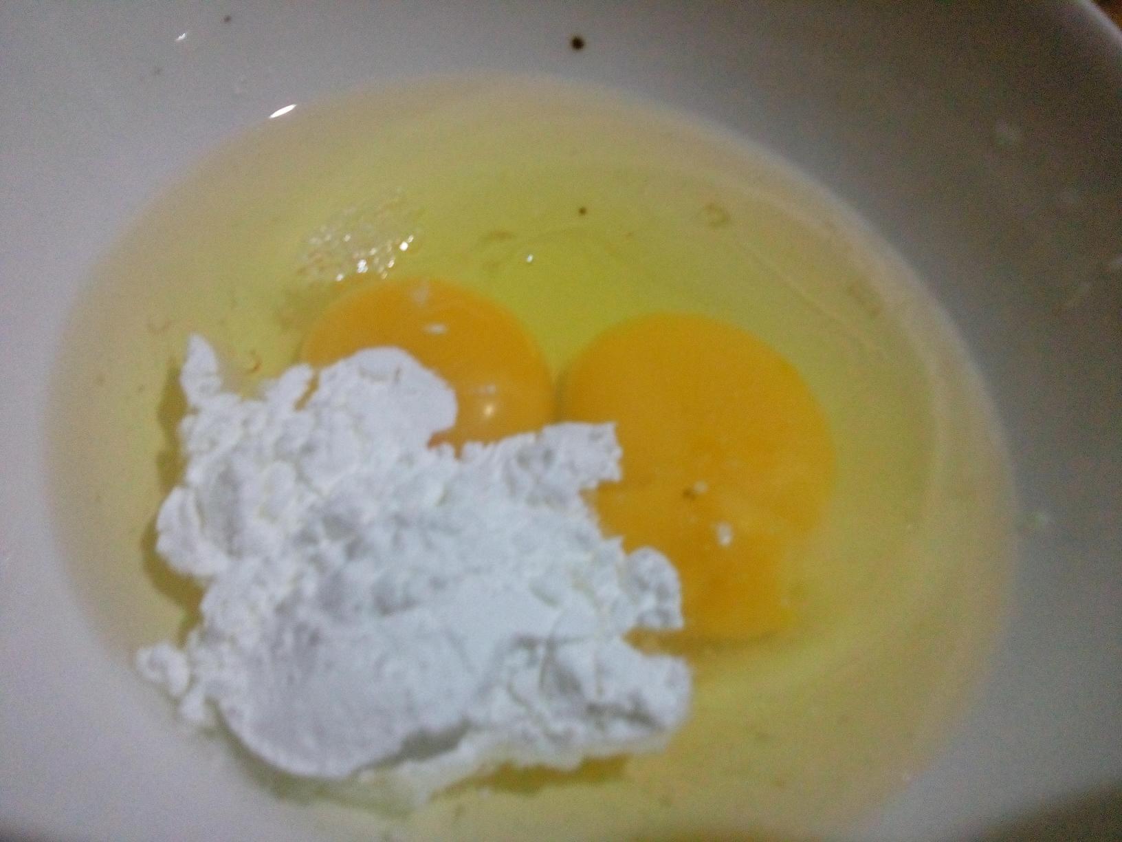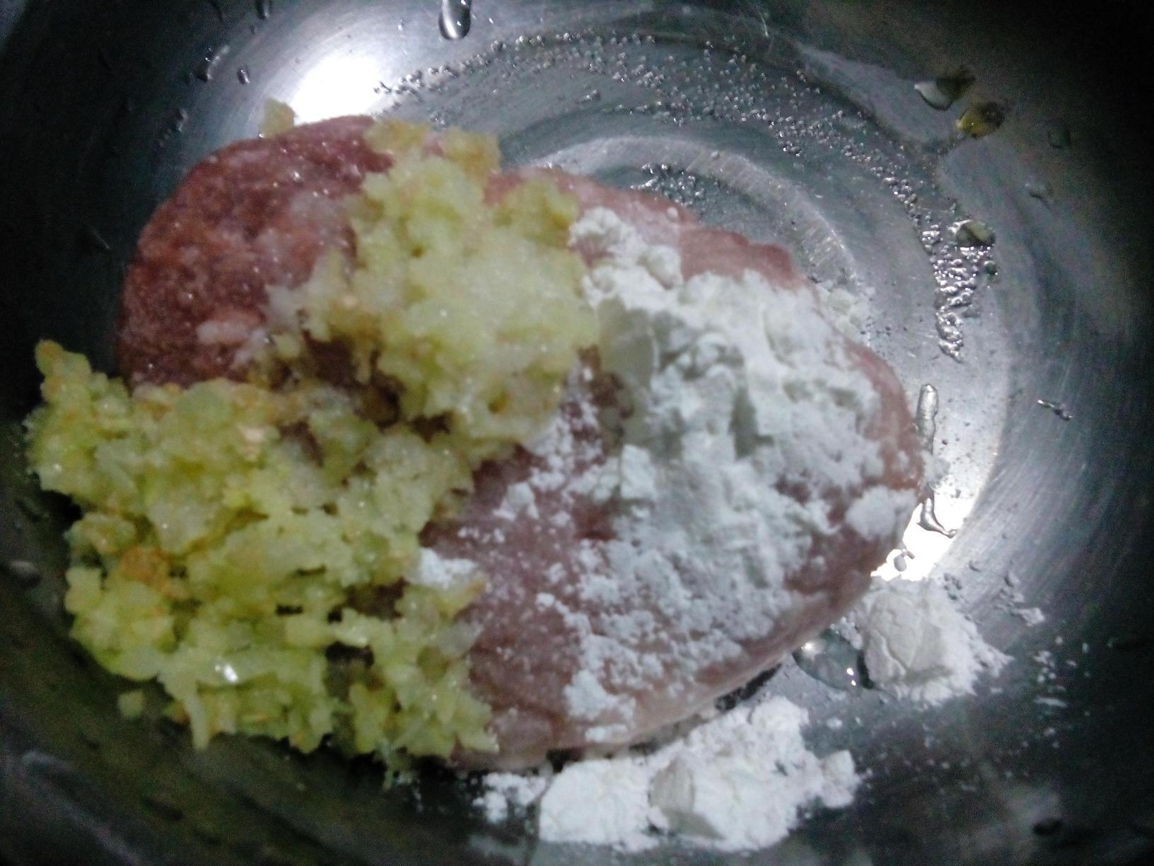 材料:猪肉馅 鸡蛋 玉米粉 淀粉 盐 糖 蚝油 油 水