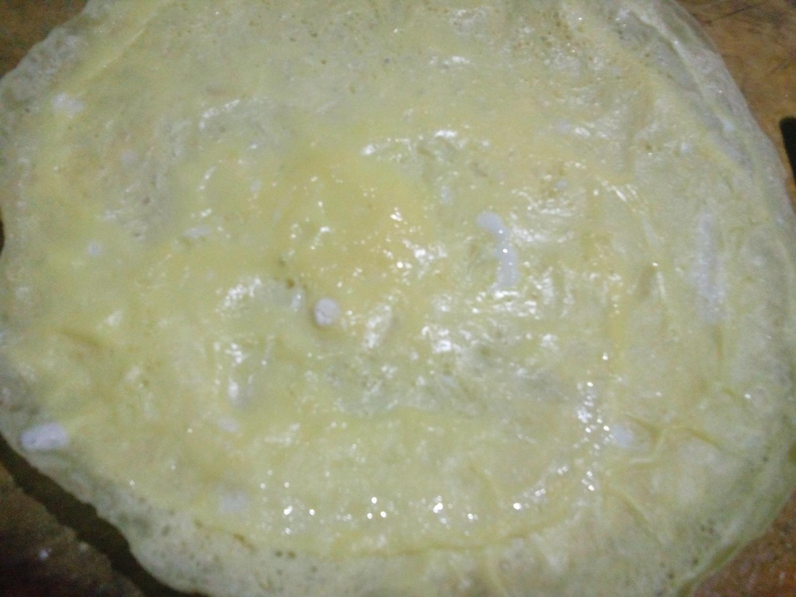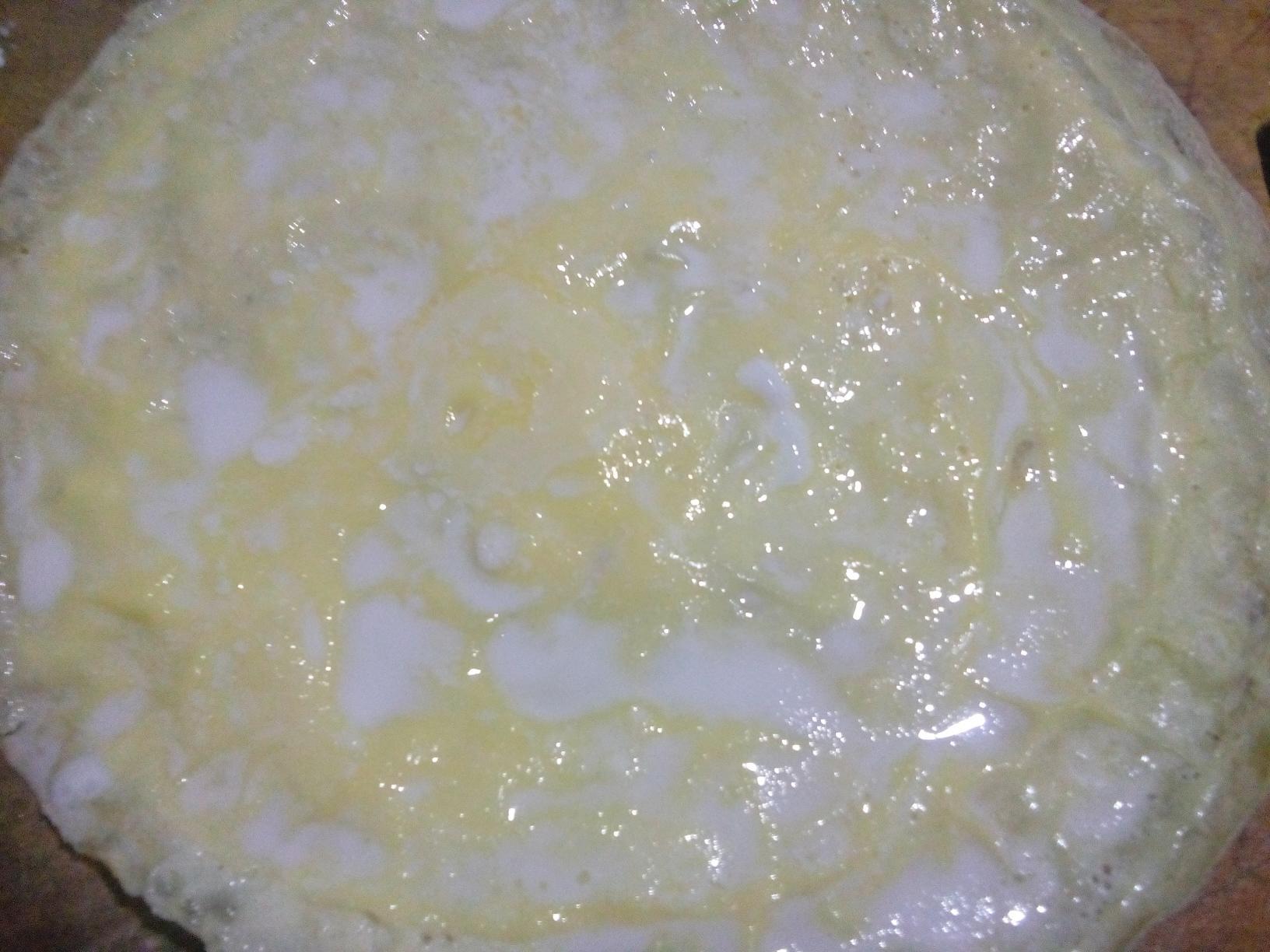 4. 用吸油纸粘少许油,在锅内擦一遍,将锅离开火,靠其温度将倒入的少许蛋液定型即可取出