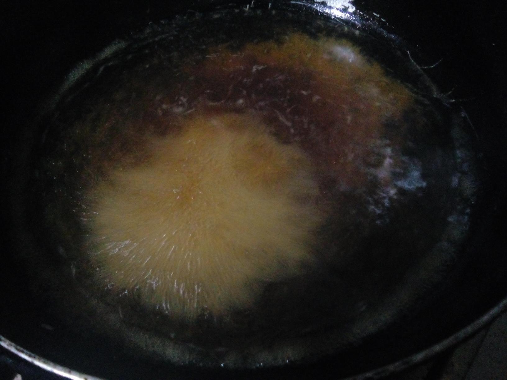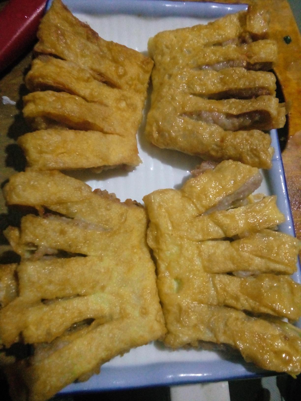 7. 锅里倒入油七分热时,将佛手卷下锅,炸至金黄即可