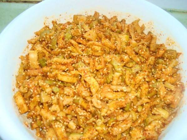 7. 清油烧热泼在芝麻辣椒面上,拌在腌了2天地萝卜条上,